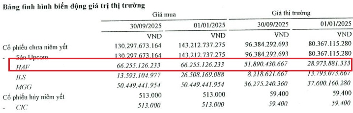Theo BCTC quý 3/2025, đến ngày 30/09/2025, khoản đầu tư của WSS tại HAF có giá gốc gần 66.3 tỷ đồng, trong khi giá thị trường chỉ còn khoảng 52 tỷ đồng, tương ứng mức tạm lỗ khoảng 22%. So với đầu năm, giá trị thị trường khoản đầu tư này đã cải thiện 79%, cho thấy mức lỗ hiện nay vẫn thấp hơn nhiều so với giai đoạn đầu 2025.
