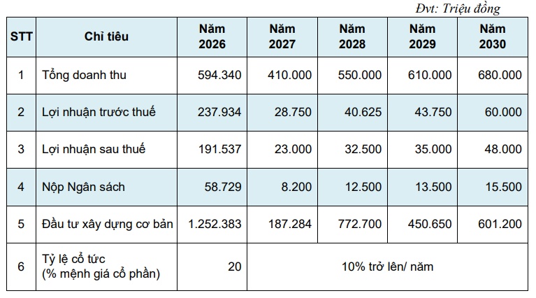 Về phân phối lợi nhuận, Công ty dự kiến trình cổ đông phương án chia cổ tức năm 2025 ở mức 50%, giảm xuống còn 20% cho năm 2026 và từ năm 2027 đến năm 2030 duy trì trên 10%.