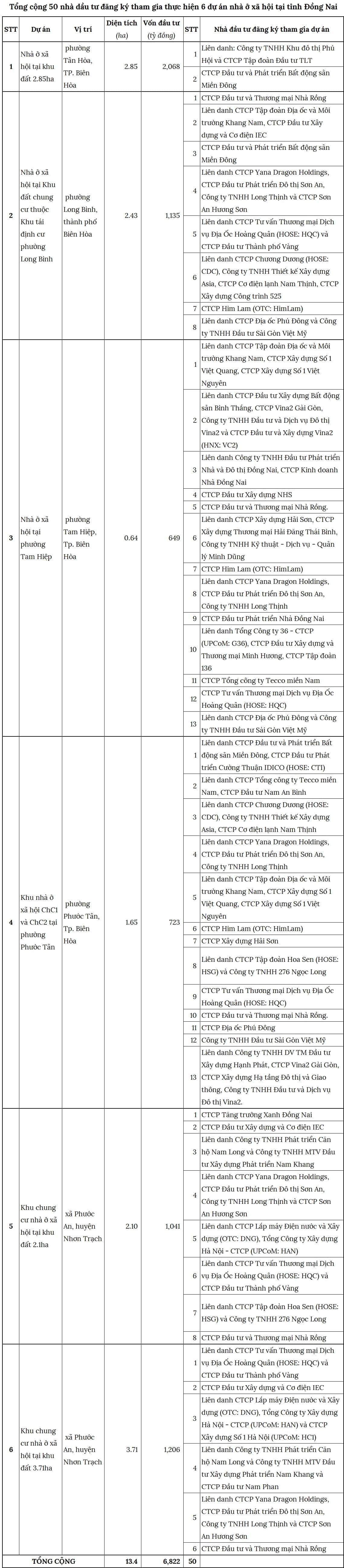 50 nhà đầu tư (bao gồm liên danh) đã nộp hồ sơ đăng ký thực hiện 6 dự án nhà ở xã hội tại tỉnh Đồng Nai, nằm phần lớn tại TP. Biên Hòa cũ, với tổng vốn đầu tư hơn 6.8 ngàn tỷ đồng, trên diện tích hơn 13ha.