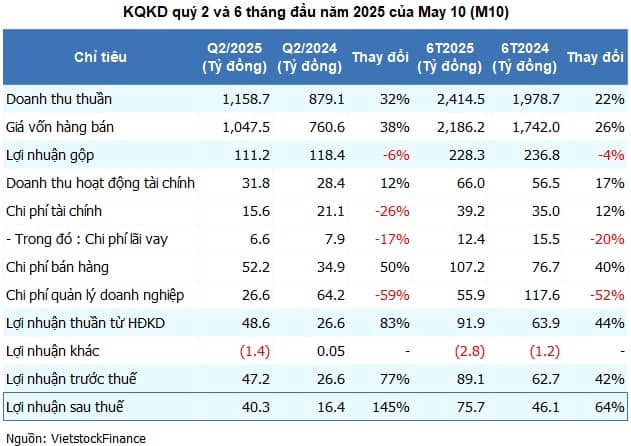 Bất chấp biên lãi gộp giảm, May 10 vẫn báo lãi ròng quý 2 hơn 40 tỷ đồng, mức cao thứ 2 trong lịch sử, nhờ cắt giảm chi phí quản lý và cải thiện tài chính. Sau 6 tháng, Công ty thực hiện được 75% mục tiêu lợi nhuận năm.
