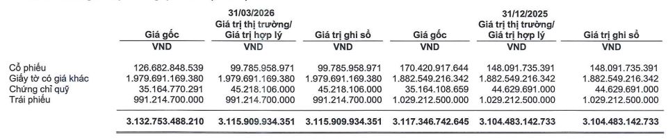 Danh mục tài sản FVTPL có quy mô hơn 3.1 ngàn tỷ đồng theo giá gốc, không biến động nhiều so với đầu năm. Trong đó, tập trung phần lớn ở khoản đầu tư vào giấy tờ có giá, gần 1,980 tỷ đồng. Chiếm tỷ trọng lớn thứ 2 là trái phiếu, giá trị 991 tỷ đồng.