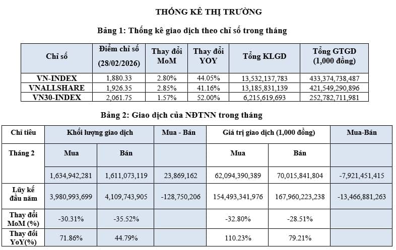 Kết thúc phiên giao dịch 28/02/2026, chỉ số VN-Index đạt 1,880.33 điểm, VNAllshare đạt 1,926.35 điểm và VN30 đạt 2,061.75 điểm. Trong tháng 2, cả 3 chỉ số chính của thị trường duy trì đà tăng điểm với mức tăng lần lượt là 2.8%, 2.9% và 1.6%.