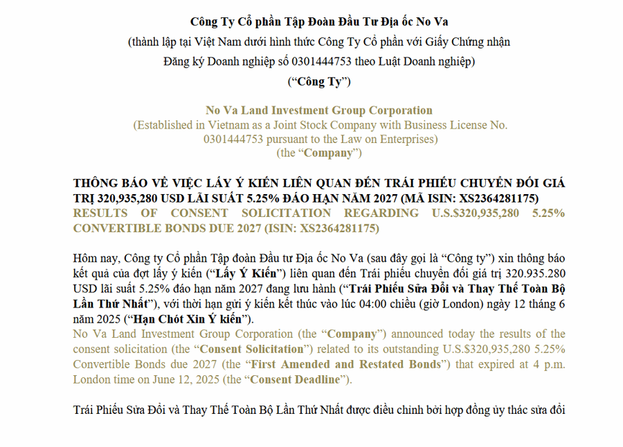 Đến thời điểm chốt lấy ý kiến, NVL đã nhận được sự chấp thuận của các trái chủ nắm giữ khoảng 86,07% tổng giá trị trái phiếu sửa đổi lần một, tương đương hơn 276,2 triệu USD. Đây là tỷ lệ tối thiểu cần thiết để thông qua các đề xuất miễn trừ và điều chỉnh điều khoản trái phiếu.