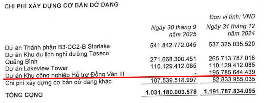 Việc mở rộng sang lĩnh vực hạ tầng khu công nghiệp từ năm 2023, giúp Taseco Land lần đầu ghi nhận doanh thu mảng này trong quý 3/2025, với hơn 636 tỷ đồng, chiếm hơn 50% tổng doanh thu.