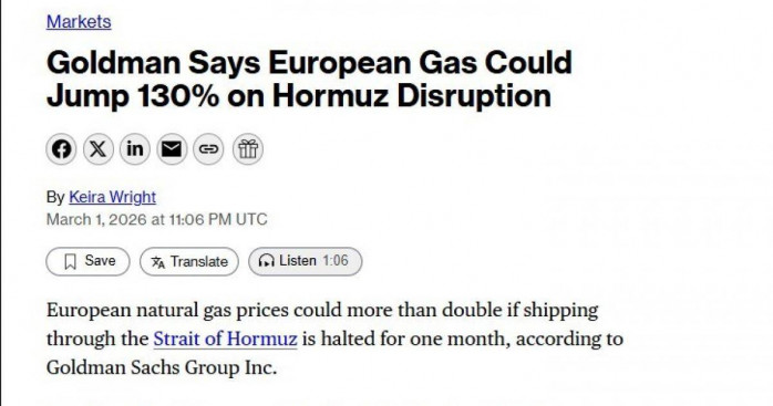 Goldman Sachs cảnh báo: Giá khí đốt châu Âu có thể tăng 130% chỉ trong 1 tháng vì xung đột ở Iran Hoàng Trung - 03/03/2026
