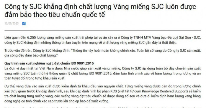 Cựu TGĐ SJC sản xuất trái phép 6.255 lượng vàng: SJC chính thức lên tiếng, khẳng định vàng miếng đạt chuẩn Trần Hà My - 11/09/2025